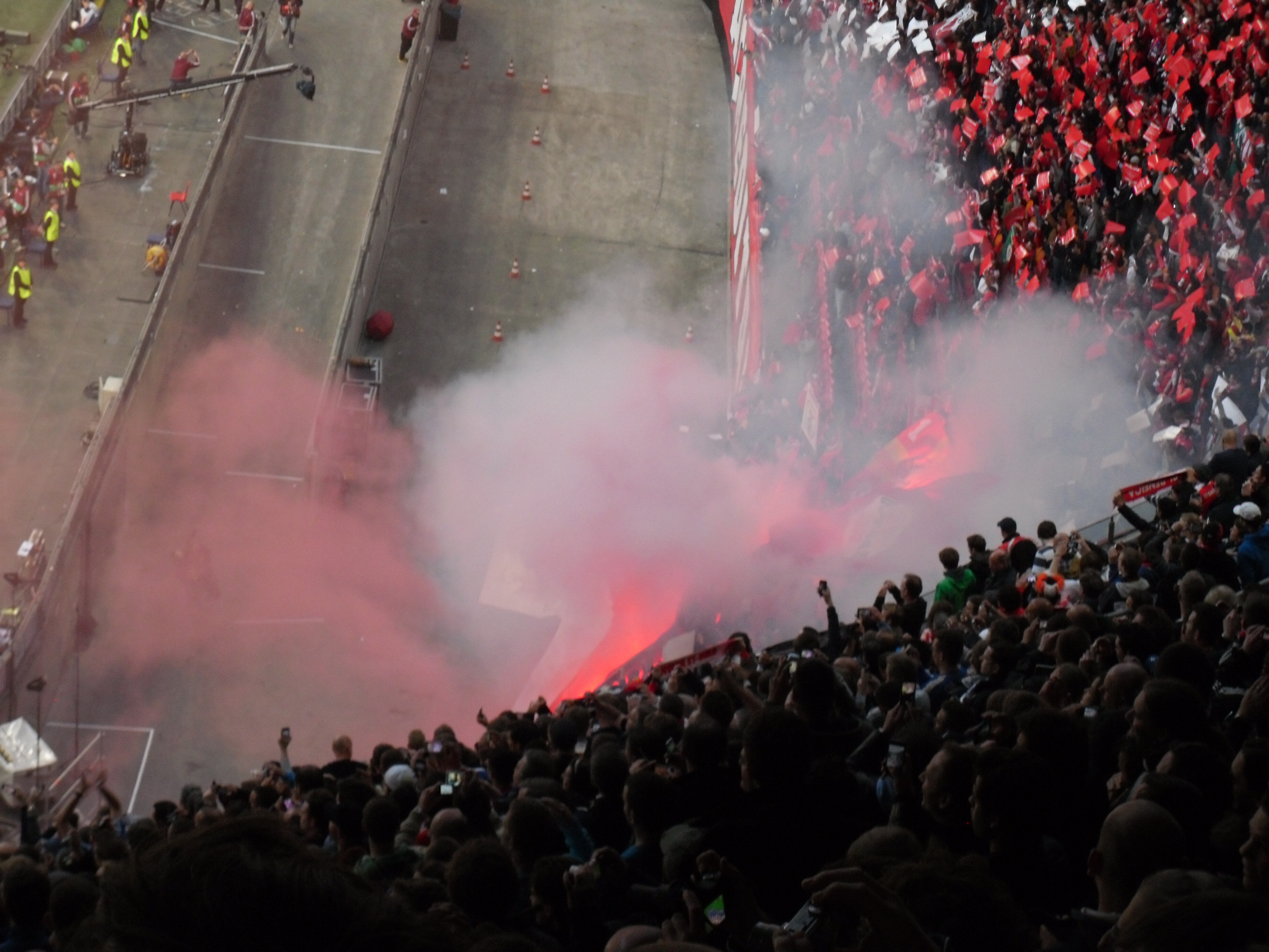 Den weiteren Tag verbrachten wir beim Bier vernichten und mit Engländern über die Spitzenmannschaften der Deutschen Bundesliga zu philosophieren. Auf dem Weg zu meinem Platz im Stadion sah ich aller Hand Gestalten, die es sich auch im Ausland nicht nehmen lassen mit ihren hässlichen Dynamo Dresden Jacken und Fanshop-Sünden anderer Vereine aufzukreuzen.