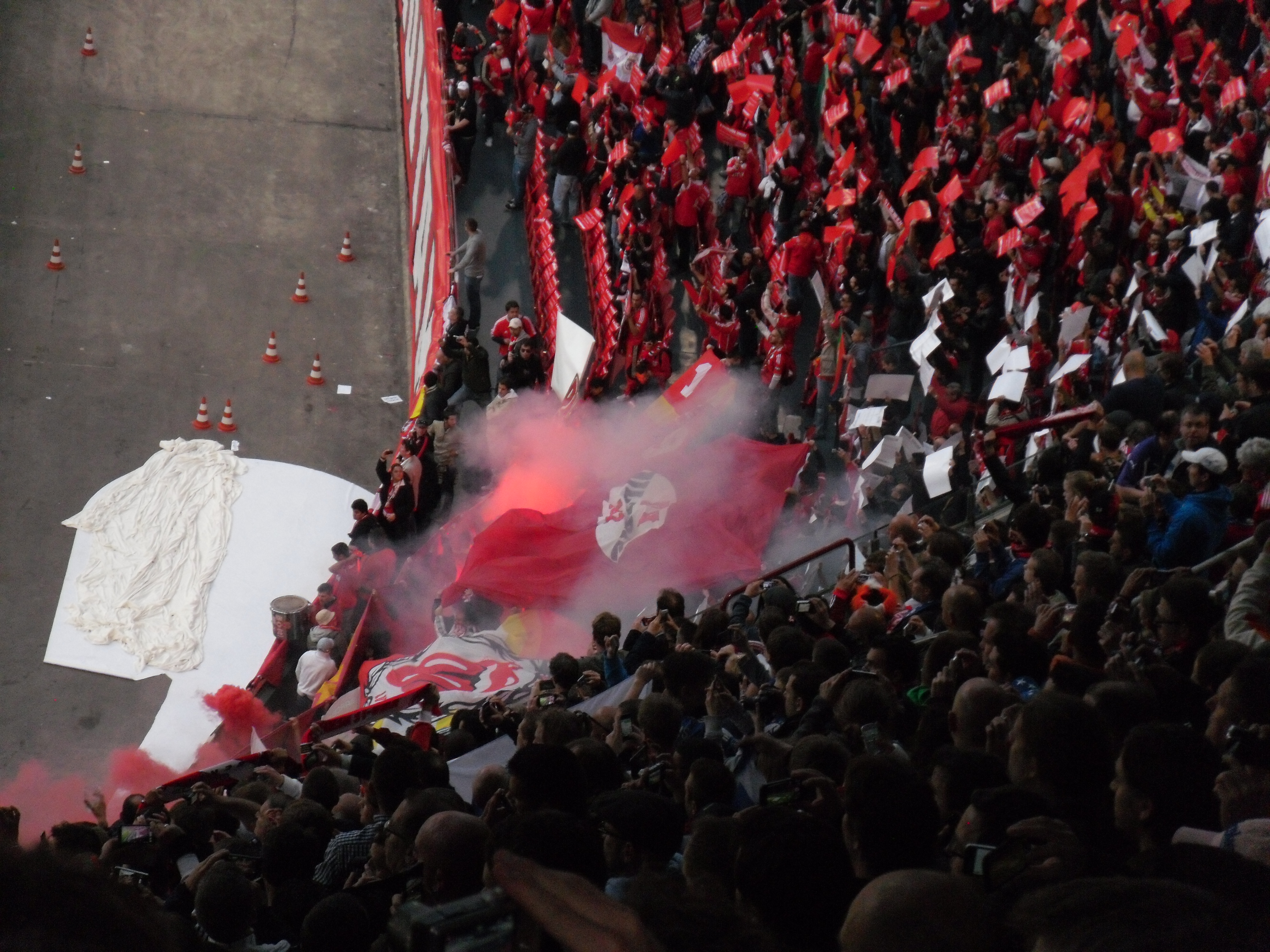 War schon sehr eigenartig. Einzig 1-2 laute Schlachtrufe waren als positive Leistungen zu verzeichnen. Der 2:1 Sieg Ihres Teams ausgenommen. Optisch konnten mich die Jungs, welche es mit Benfica Lissabon hielten, sogar leicht überraschen. Zum Intro wurden in der Kurve rot/weiße Zettel präsentiert. Zur Komplettierung gab es 3 Überziehfahnen, welche das Emblem des Vereins sowie den UEFA Cup zeigten. Dazu gab es im Unterrang die passenden Aufforderung zu Siegen per Schriftzug. Kurzzeitig erhellten dazu einige Bengale die Kurve.