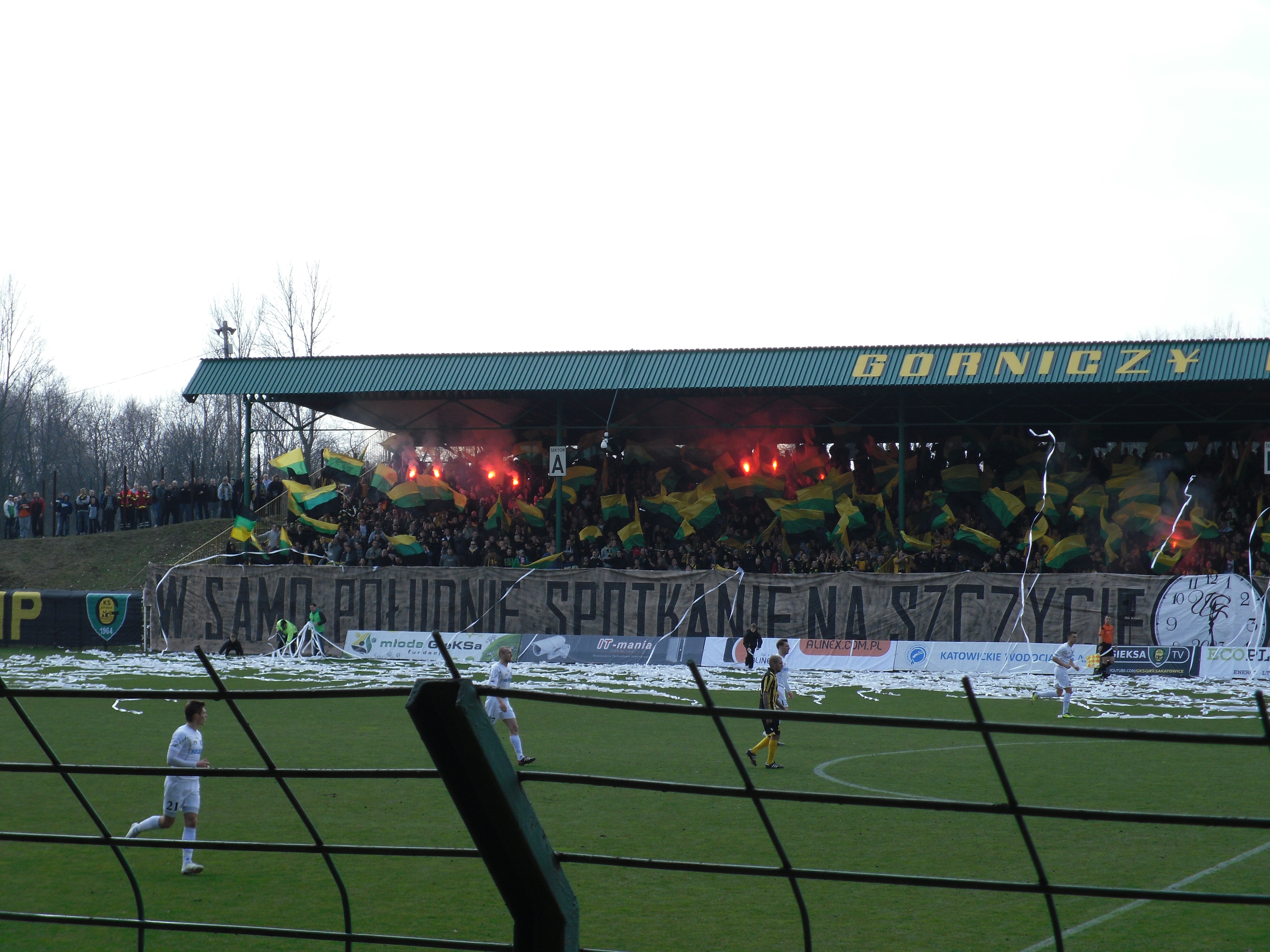 Die Gegengerade, welche den aktiven Kern von GKS beherbergt, wurde zu diesem Spiel mit 3000 Mann bevölkert. Unterstützung erhielten Sie hierbei von einer guten zweistelligen Anzahl an Freunden aus Ostrava. Akustisch wurde wie von uns erhofft ein sehr gutes Level erreicht und auch optisch wurde eine schöne Aktion durchgeführt. Mit einer geschlossene Schalparade wurde der Beginn des Spiels eingeleitet.